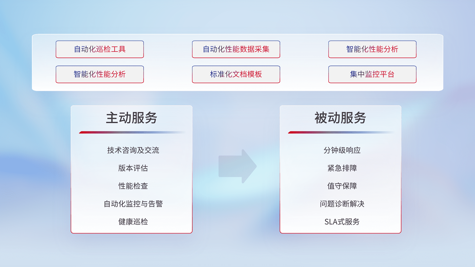 智能化工具和标准化文档,,保障服务质量,,提供主动服务(包含技术咨询、、版本评估、、、、性能检查、、、自动化监控与告警、、健康巡检)和被动服务包含(分钟级响应、、紧急排障、、值守保障、、问题诊断解决、、、、SLA服务)。。。。